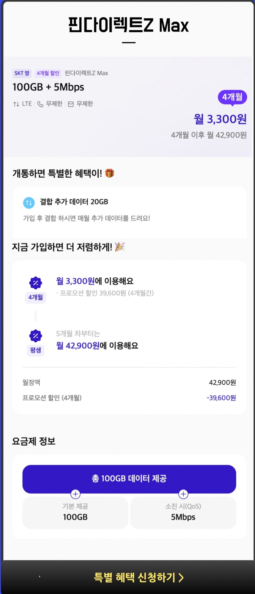 100기가+5mps 통화문자무제한 3300원 4개월